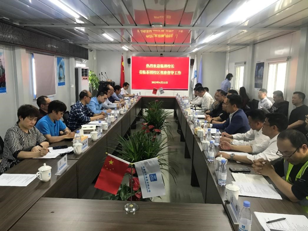 2023412日下午,温涛校长率队到茶园校区工地调研新校区建设推进情况。党政办、新校区建设指挥部办公室、基建处、财务处、审计处、资产处、采招中心部门负责人陪同调研。代建、全过程咨询、跟踪审计、施工等相关单位负责人参加了座谈交流。