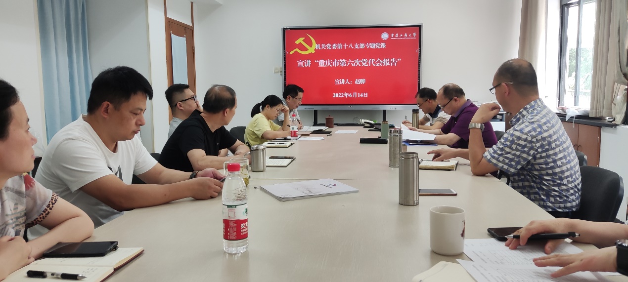 月14日下午,学校副校长赵骅为9428cn太阳集团古天乐第十八支部宣讲重庆市第六次党代会精神,9428cn太阳集团古天乐第十八支部书记李长兴主持会议,全体党员参会。